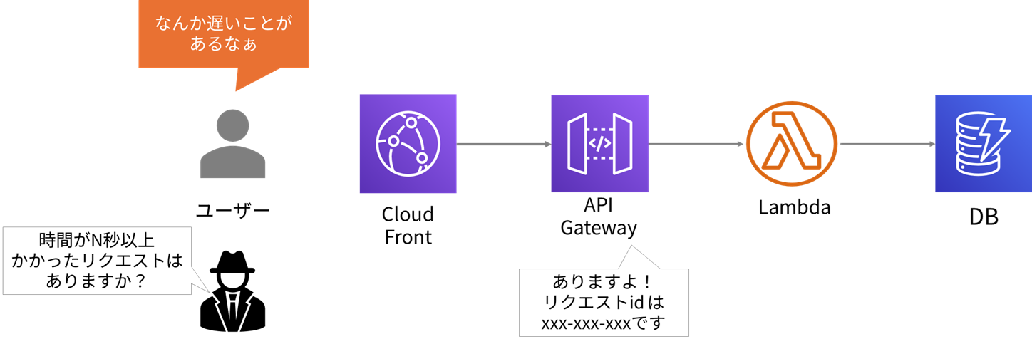 トレースというのは、サービスがリクエスト毎にIDを割り振り、そのリクエストの処理の流れや各コンポーネントでかかった時間を追跡できる仕組みです。API Gatewayはこのトレースに対応しているので、手がかりを持っているはずです。聞いてみましょう。