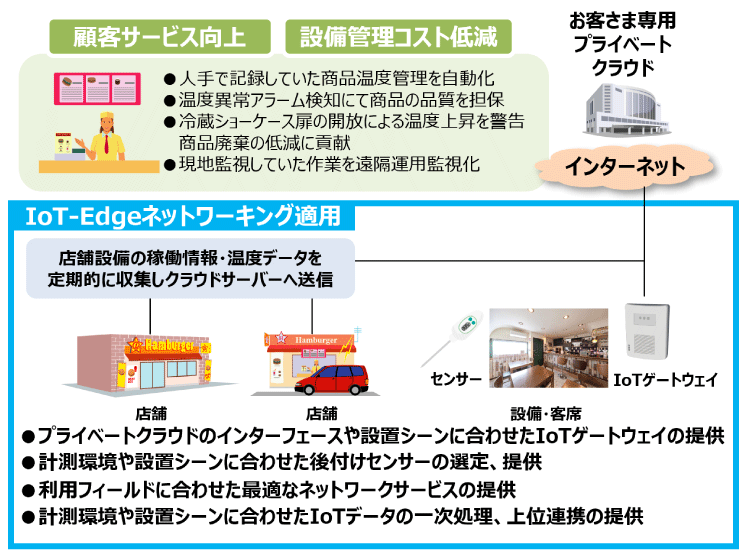 店舗設備や客席から温度情報を収集・可視化、適正温度を外れた場合にアラーム通知(遠隔運用監視)