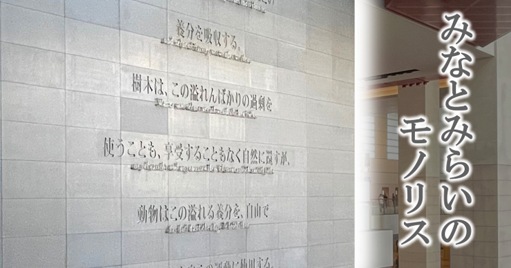 私も、通勤で毎日繰り返し、上り・下りしてこのモノリスを、何千回と目にしていると詩文のとくに最後のフレーズが頭に残ってしまっています。「束縛を少しずつ断ち切り」「やがて自らの姿を 自由に変えていくのである」…樹木でなく自分自身が投影されて少し勇気がもらえる気がしています。