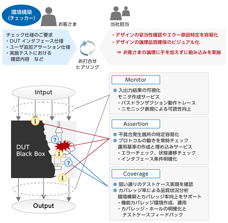 お客さまからチェック仕様のご要求をいただき、デザインの妥当性確認やエラー原因特定の容易化、デザインの論理品質確保のビジュアル化など、Monitor、Assertion、Coverageを駆使しお客さまの論理に手を加えずに組み込みを実施します。